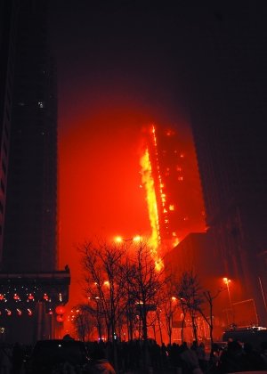 記者站在距大廈一兩百米遠(yuǎn)的地方仰望大廈,150多米高的B座公寓樓西側(cè)和南側(cè)火勢最大,團(tuán)團(tuán)火苗和濃煙從墻體上升起,大火迅速向大廈內(nèi)部蔓延,一個個窗戶內(nèi)接連噴出火苗,大火燃燒發(fā)出陣陣響聲,并不斷掉下一些燃燒物。兩個高架水槍升空雖然達(dá)到幾十米,仍然對高處大火無可奈何。大火在燃燒1個多小時后,又向200多米高的A座主樓蔓延,主樓很快也燃起大火。